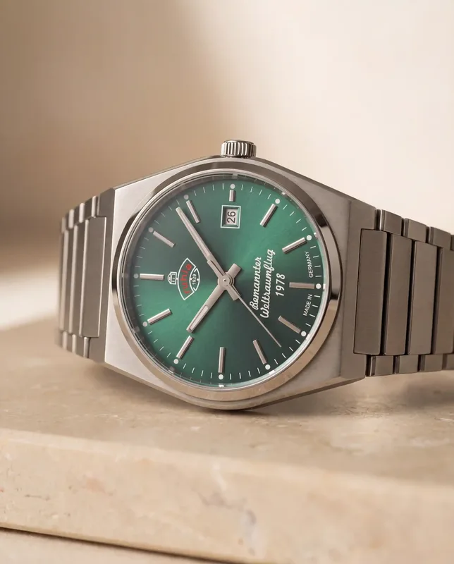 Ruhla 1978 Space Control zegarek męski stalowy zielona tarcza premium ujęcie hero Lumacontext AI